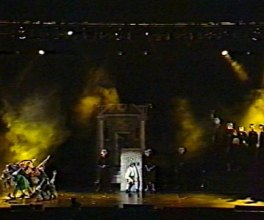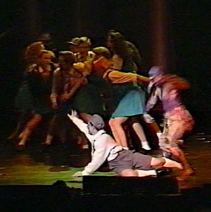 I don’t have any good photos from some of the earlier Rock Eisteddfods we did so have taken some screen grabs from a pretty dodgy quality DVD. I think you still get the gist of the performance. This one was called ‘A hellish daydream’ (1989) and featured a sped-up Queen’s Bohemian Rhapsody and an opening scene in black and white which turned into colour. Daniel Parkinson made the great glowing devil head.