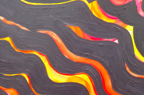 I have a stock pile of canvases now so am working on a few a once. I’m still working on water, bubbles and fish (technical exercises). This grab is of a painting with working title ‘Lava’—which has resulted from the ‘waste paint’ explorations. Many more layers to come I think with this one.