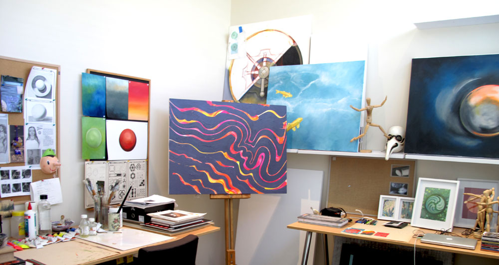 I am working on a series of ‘seals’ or ‘monograms’ which are visual puns or conundrums. The grab above is a work titled ‘Watercrest’. I’m layering paint, pen and pencil in these works. I want to explore transparent glazes. The spheres are the basis for these works.